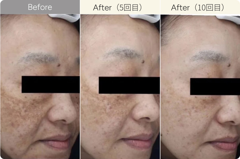 額や頬、目や口の周りに左右対称現れます。女性ホルモンのアンバランスなどが原因と考えられており、レーザ治療では逆に色素が沈着してしまうことがあります。